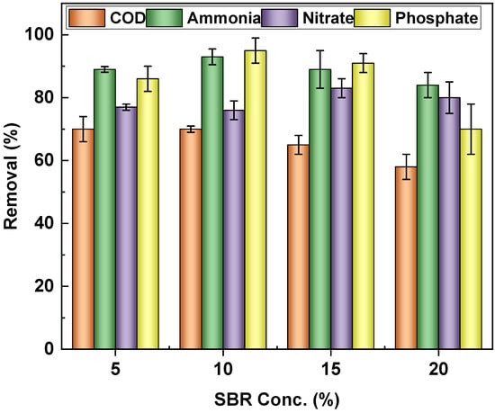 Removal efficiency of COD and nutrients at different concentrations in SBR.