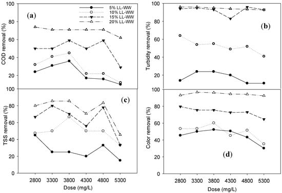 COD, turbidity, TSS and color removal efficiency following coagulation–flocculation as a post-treatment option to SBR increased as the concentration of landfill leachate increased in the wastewater mixture (Figure 2 and Figure 3). In general, leachate treatment efficiency either remained stable or dropped as both coagulant doses increased. Univariate ANOVA revealed a statically significant difference between alum and ferric chloride for COD removal (alum: F3.0 = 28.8, p ≤ 0.001 (Figure 2a); FeCl3: F3.0 = 4.67, p ≤ 0.01 (Figure 3a)), turbidity (alum: F3.0 = 367.9, p ≤ 0.001 (Figure 2b); FeCl3: F3.0 = 18.2, p ≤ 0.001 (Figure 3b)), TSS (alum: F3.0 =13.3, p ≤ 0.001 (Figure 2c); FeCl3: F3.0 = 4.52, p ≤ 0.001 (Figure 3c)) and color (alum: F3.0 = 39.5, p ≤ 0.001 (Figure 2d); FeCl3: F3.0 = 8.34, p ≤ 0.001 (Figure 3d)) between 5%, 10%, 15% and 20% leachates. The post hoc t-test indicated that COD, turbidity and TSS removal by alum led to insignificant differences (p > 0.05) at 5% and 10% leachate concentrations, whereas the data showed significant differences (p < 0.05) at 15% and 20% landfill leachate. Color removal by alum showed an insignificant difference (p > 0.05) at 5% leachate while at 10%, 15% and 20% leachate significant difference (p < 0.05) was observed. The main reason for this could be due to the higher mixing ratio of leachate at (10%, 15% and 20%) compared to the 5% treatment, it could be that as the leachate increases the color strength would increase too leading to its better removal. The post hoc t-test showed that COD, turbidity, TSS and color removal by ferric chloride had insignificant differences at 5%, 10%, and 15% leachate while there was a significant difference at 20% leachate.