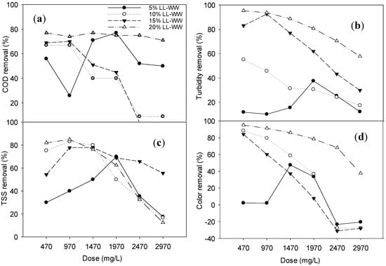 - Muniz, G.L.; da Silva, T.C.F.; Borges, A.C. Assessment and optimization of the use of a novel natural coagulant (Guazuma ulmifolia) for dairy wastewater treatment. Sci. Total Environ. 2020, 744, 140864. [Google Scholar] [CrossRef]