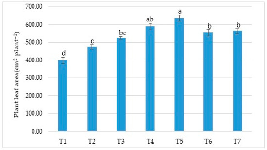 Effects of treatments on leaf area (cm2 plant−1). Means (±sd) that differ significantly at the 5% level shown with different letters. (T1) No fertilizer (control), only water; (T2) Biofarm + Botanica; (T3) Biofarm + Botanica + Rizofil; (T4) Biofarm + Botanica + Subtima; (T5) Biofarm + Botanica + Fontera microzone; (T6) Biofarm + Botanica + Endo Roots Soluble (mycorrhiza); (T7) Biofarm + Botanica + Bontera.