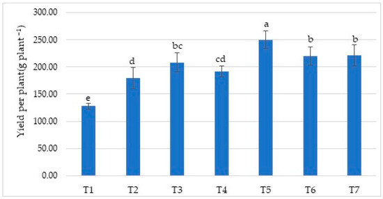 Effect of treatments on yield per plant (g plant−1). Means (±sd) that differ significantly at the 5% level shown with different letters. (T1) No fertilizer (control), only water; (T2) Biofarm + Botanica; (T3) Biofarm + Botanica + Rizofil; (T4) Biofarm + Botanica + Subtima; (T5) Biofarm + Botanica + Fontera microzone; (T6) Biofarm + Botanica + Endo Roots Soluble (mycorrhiza); (T7) Biofarm + Botanica + Bontera.