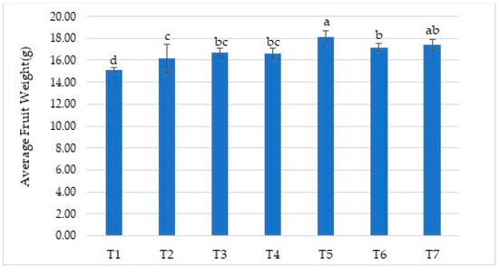 The effect of treatments on average fruit weight (g). Means (±sd) that differ significantly at the 5% level shown with different letters. (T1) No fertilizer (control), only water; (T2) Biofarm + Botanica; (T3) Biofarm + Botanica + Rizofil; (T4) Biofarm + Botanica + Subtima; (T5) Biofarm + Botanica + Fontera microzone; (T6) Biofarm + Botanica + Endo Roots Soluble (mycorrhiza); (T7) Biofarm + Botanica + Bontera.