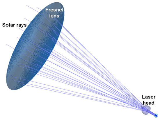 Primary concentrators are usually part of the first stage to concentrate the solar power to excite the laser medium. Among the main factors that influence the choice of concentrator are the efficiency, accessibility, cost, and ease of manufacturing. Parabolic mirrors benefit from the high solar flux attained. However, they are expensive, heavy, and not easily available. On the contrary, Fresnel lenses are low cost, lightweight, and easy to produce. Their drawback is their chromatic aberration, which decreases their efficiency. Nevertheless, unlike the parabolic mirrors, the laser head is positioned behind the Fresnel lenses and thus no shadows are created. Both primary concentrators have been used for solar laser research [3,9,10,11,12,13,14,15]. Using a parabolic mirror, the record solar laser collection efficiency and solar-to-laser conversion efficiency with a single laser rod are 38.2 W/m2 and 4.5%, respectively [14].