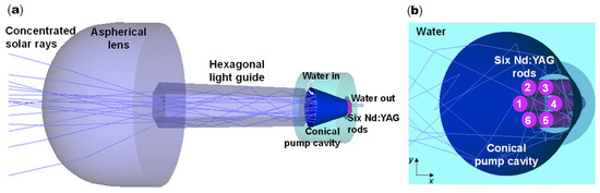 The fused silica aspherical lens had a 140 mm diameter, 100 mm height, and −70 mm rear radius. The fused silica hexagonal light guide had a 34 mm input face width, 28 mm output face width, and 130 mm height. The hollow conical pump cavity with a 95% inner surface reflectivity had a 34 mm input aperture diameter, 14 mm output aperture diameter, and 31 mm height. Water was used as the cooling fluid, as shown in Figure 2.