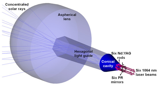 The solar laser head was composed of an aspherical lens, which coupled the concentrated solar radiation from the focal zone of the Fresnel lens into a hexagonal light guide, which transmitted and homogenized the radiation into a conical pump cavity within which the six Nd:YAG rods were evenly arranged (Figure 2).