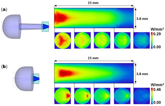 Absorbed pump flux distributions along the longitudinal and five transversal cross sections of a 3.8 mm diameter, 15 mm length Nd:YAG rod in the laser head with: (a) the aspherical lens and hexagonal light guide, and (b) only the aspherical lens.