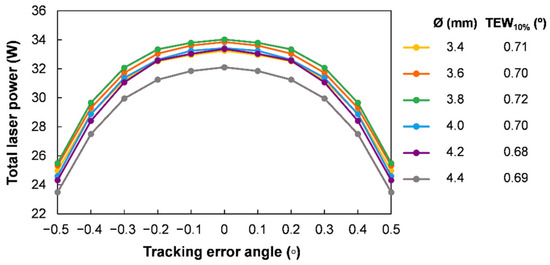 The Nd:YAG rod diameter was optimized for the laser head with the aspherical lens and light guide. In Figure 5, the total multimode laser power from the six rods as a function of the solar tracking error in the azimuthal direction, for different rod diameters, is represented. The laser head with 3.8 mm diameter, 15 mm length Nd:YAG rods presented not only the maximum total laser power of 34.0 W, but also the best TEW10% of 0.72°.
