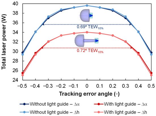 The best rod dimension, 3.8 mm diameter with 15 mm length, was then used for the laser head without the light guide. The total multimode laser power from both laser heads was compared by studying it as a function of the solar tracking error in the azimuthal (∆α) and altitude (∆h) directions, as shown in Figure 6. Each solar laser head evidenced a symmetric tracking error compensation capacity for the azimuthal and altitude directions, having a similar total laser power and TEW10% in both directions. The laser head without the light guide had a higher maximum total laser power of 39.6 W, but a lower TEW10% of 0.69°, than the one with the light guide (Figure 6). Therefore, both laser heads could operate with a more simple and less expensive STS [22].