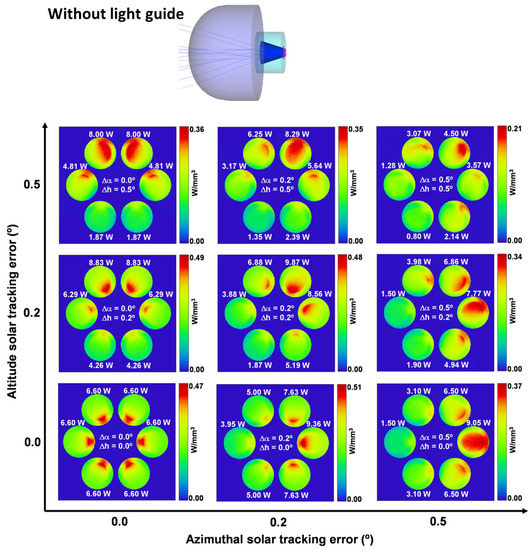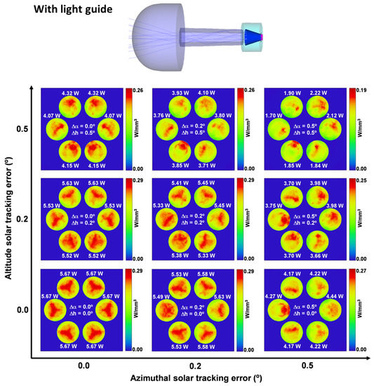 The laser emission uniformity performance is also demonstrated in Figure 9. The laser head with the light guide produced six solar laser emissions with almost the same laser power, even under the most extreme solar tracking error condition of ±0.5° (Figure 9a). On the contrary, the laser head without the light guide produced six laser emissions with significantly different laser powers under solar tracking error variation (Figure 9b).