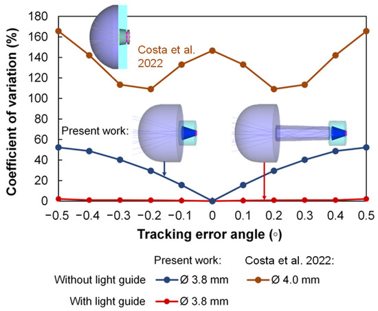 In Figure 11, the CVs of the 3.8 mm diameter, 15 mm length rods in both laser heads with and without the light guide are shown, as well as the CV results from the previous work with seven 4.0 mm diameter, 13 mm length Nd:YAG rods in a laser head with an aspherical lens and a conical pump cavity [28]. The CV of the laser head with the light guide was much lower under the solar tracking error condition than that of the other laser heads without light guide (Figure 11). For the laser head with no light guide, a maximum CV of 52.31% was achieved at the tracking error angle of ±0.5°. A maximum CV of 165.63% was obtained from the laser head of the previous work at the same tracking error angle (Figure 11) [28]. The homogenizer was thus essential to reduce the CV and maintain the uniformity of the laser power emission among the rods under the solar tracking error condition.