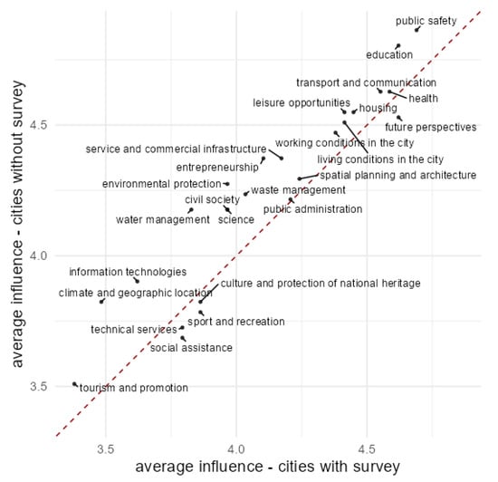 The first observation from the results is the high similarity of results for the two groups of surveyed offices. Both cities with and without formalized quality-of-life surveys similarly assess the impact of individual areas on quality of life (Spearman’s rank correlation coefficient is 0.95, p-value < 0.001). Considering the average, the surveyed areas can be divided into three groups. The first group is the areas that obtained a mean above 4.5, which can be considered areas that have a high impact on quality of life. Among the first group of surveyed authorities, five such areas were indicated, and among the second group, eight. Interestingly, all areas indicated by respondents in cities that conduct formalized surveys were also indicated by respondents in cities that do not conduct formalized surveys. Regardless of the group used, cities believe that public safety, education, future prospects, health, transportation and communication have a high impact on quality of life in the city. The second group, in which the average value was above 4 and below 4.5, can be considered to have areas that affect quality of life to an average degree. Cities in the first group identified 9 such areas and cities in the second group identified 10 areas. They had many similarities and differences. An example is environmental protection, whose impact was rated relatively high by cities that do not conduct formalized surveys and was omitted from this group by cities that conduct formalized quality-of-life surveys. The third group, in which the average value is below 4.0, can be considered areas with no clear impact on the quality of life. Some cities believe that these areas affect quality of life, while others take the opposite view. Within this group, the first group of cities indicated 11 areas and the second group of cities indicated only 7 areas. The differences in the assessment of the impact of individual areas on quality of life are the greatest in this group. Summarizing the comparison conducted, it should be said that cities that do not conduct formalized quality-of-life surveys indicate more areas in the first two groups, and usually, the average assessment of the impact of an area is higher. This means that this group of cities indicated more areas that affect quality of life compared to the group of cities that conduct formalized surveys and higher average ratings of the impact of most areas on quality of life.