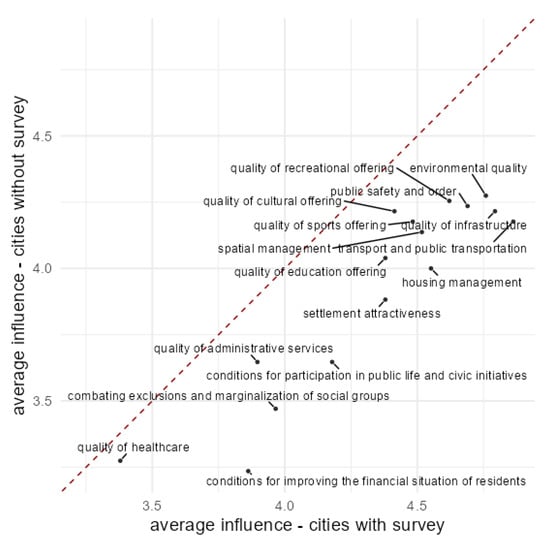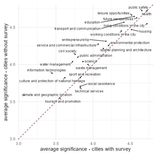 To assess whether there were significant differences between the group of cities that conduct formalized quality-of-life surveys and the group that does not conduct such surveys, the significance of the difference in diameters in each area was calculated using a Mann–Whitney test. After calculating the p-value in all areas, it was found that there was no significant difference (the p-value in no area was less than 0.05), which means that there are no significant differences regarding the assessment of areas that affect quality of life in cities that conduct and do not conduct formalized quality-of-life surveys. As with the impact assessment, despite the lack of significant differences in the averages in each area, it can be seen that most areas received a higher rating than those by cities that do not conduct quality-of-life surveys. Figure 2 shows the average rating of each area’s relevance by cities that conduct quality-of-life surveys (X-axis) and cities that do not (Y-axis).