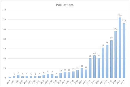We collected 818 articles (articles and reviews) registered on Web of Science up until the end of 2021 via data cleansing using CiteSpace. Figure 1 shows that the number of publications has been gradually increasing since the 1990s, along with the rise in TOD projects worldwide. There were fluctuations in 1996, 2003, and 2006. It can also be observed that, in 2013 and 2020, the number of articles published on this topic increased dramatically.