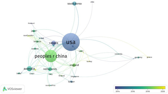 To determine the extent of research cooperation, VOSviewer was used to visualize the network between countries and research institutions. There were 53 major countries involved in the research of TOD from 1994 to 2021. The threshold was set to two, and forty-three countries reached this threshold. The size of the nodes, as shown in Figure 2, represents the number of articles published from various countries. The links show the cooperation network between the countries. The USA is the most prolific contributor, with 341 research documents and 8619 citations, and it also has the highest link strength, followed by the People’s Republic of China and Australia, which published 202 articles and 58 articles, respectively. The frequency of TOD-related publications in other countries was below 50. In addition, in Asia, South Korea published 40 English articles with 864 citations and Japanese researchers published 18 English articles with 260 citations.