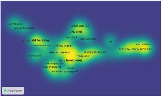 From 1994 to 2021, 666 major research institutions were involved in TOD-related research. The threshold was set to three, and 122 research organizations reached this threshold. As can be seen in Figure 3, the two most influential research institutions were the University of Hong Kong and the University of California, Berkeley, which published 30 and 28 articles on the topic of TOD, respectively. Publications from the University of California, Berkeley, had the most citations with 1287. The main research topics at the University of Hong Kong were land use, transport integration, and urban growth. Researchers at the University of California, Berkeley, on the other hand, were more concerned with street design. The third-ranked institution, the University of Minnesota in the USA, contributed 22 publications with 564 citations from 1994 to 2021, with the main research topic being urban growth.