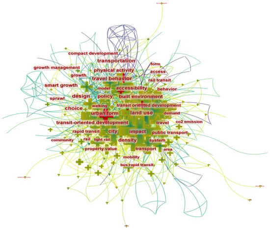 CiteSpace is a scientific bibliometric analysis tool [36]. We used CiteSpace to perform a quantitative keywords co-occurrence analysis of the literature downloaded from the WOS database, with the aim of understanding the main theme and domain of current research on transit-oriented development (TOD). According to the keyword co-occurrence network (Figure 4), by eliminating the retrieval term, the top 10 most frequently used keywords are “land use”, “impact”, “built environment”, “travel”, “accessibility”, “city”, “density”, “transport”, “travel behavior”, and “rail transit”, which can thus be regarded as the major fields and main research areas in TOD.