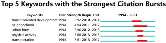 As illustrated in Figure 6, the presence of keywords was analyzed. The top five emerging strengths are transit-oriented development (search term), neighborhood, urban form, physical activity, and transportation. These are all new terms that emerged after 2010.