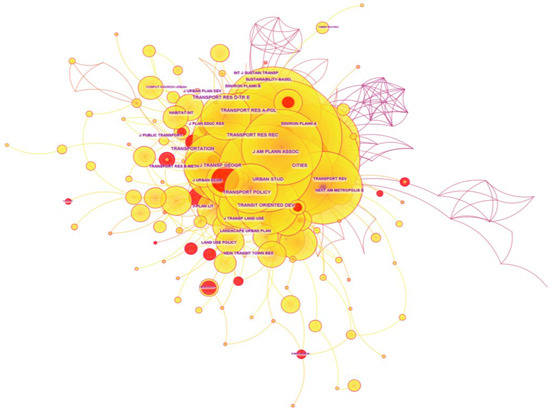The results of a cited journal co-occurrence network, generated via CiteSpace analysis, are shown in Figure 7. The number of network nodes is 237 (N = 237), and there are 716 links (E = 716) connecting these nodes. The density of the cited journal co-occurrence network is 0.0256 (density = 0.0256). The larger the circle of a node, the higher the citation rate of the journal. Papers from Transportation Research Record were cited 484 times. Papers from the Journal of Transport Geography were cited 448 times, and the total citation number of papers from the Journal of the American Planning Association was 425. It can be observed that the journals with the highest citation rate of research papers on TOD mainly belong to the fields of transport and urban planning.