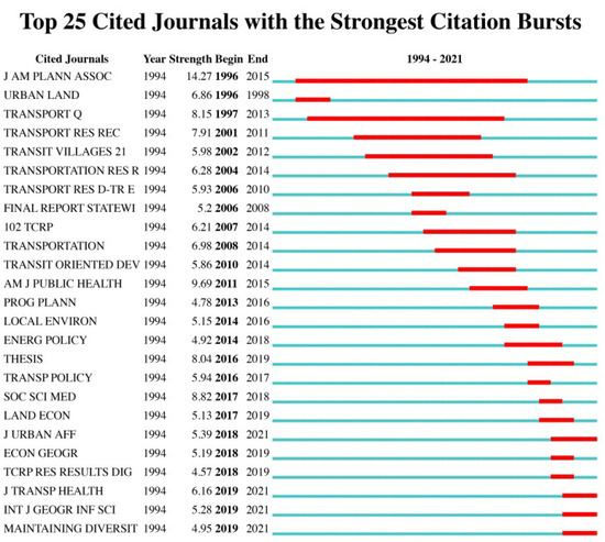 For the period between 1994 and 2021, considering the burst values (Figure 8), the Journal of the American Planning Association ranked in first place, with a value of 14.27 for about 20 years (from 1996 to 2015). Secondly, the American Journal of Public Health and Social Science & Medicine also has high burst values. Scholars have integrated the study of TOD with social public health and human habitats. The Journal of Transport & Health, the International Journal of Geographical Information Science, and Maintaining Diversity all have significantly higher burst values between 2019 and 2021, placing them as emerging journals that have been highly cited in the TOD field in recent years. While most of the research published has been on TOD from the perspective of transport and urban planning, in recent years, public health and geo-information technology have also come into the public eye.