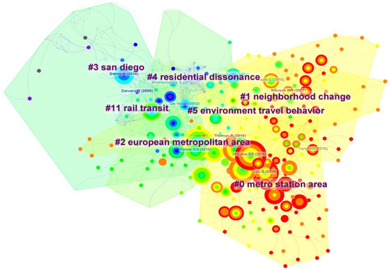 Figure 9 shows the co-citation analysis on the topic of TOD performed by CiteSpace, and Table 1 lists the top ten most cited references. In the co-citation analysis, the number of co-citation network nodes was 664 (N = 664), and there were 1527 links (E = 1527) connecting these nodes. The density of the co-citation network was 0.0069 (density = 0.0069), with the low density indicating that there is less cross-referencing between the publications. The size of the nodes in Figure 9 indicate how frequently an article has been mentioned. At the same time, the length of the distance between the nodes suggests whether the articles are closely related to each other. When there is a substantial association between the publications, it suggests that they are more frequently mentioned together in later studies.