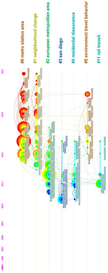 Furthermore, the time span covered by the clusters varies, as shown in Figure 11. These retrieved clusters represent the cutting edge of TOD research. Research on metro station areas was prominent from 2014 to 2020. Articles on the topic of San Diego were dominant for five years from 2008 to 2013. The majority of popular themes emerged after 2011.