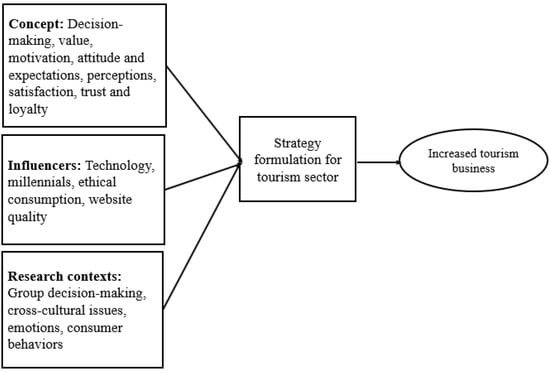 The study on consumer behavior in tourism revealed the key research gap in studying the hedonic and affective aspects of tourism [9]. Figure 1 shows the tourism expansion model. Various concepts, influences, and research contexts prevail in the sector and may be explored to expand the tourism sector by enhancing the e-value experience of travel website users. Tourism operators may adopt various strategy formulations to increase tourism business. A travel website’s quality may differ in providing usability, flexibility, visibility, and agility dimensions to motivate website visitors to revisit the webpage and motivate their purchase intention.