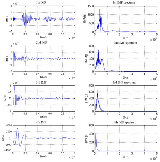 Empirical mode decomposition is applicable for nonlinear nonstationary signals and provides high accuracy with regard to both time and frequency [23,24]. In addition, the signal processing does not require prior analysis, so it is suitable for removing surface direct waves. This method first decomposes the detected signal into empirical modes to obtain several intrinsic mode functions (IMFs) and then selects the corresponding IMFs to reconstruct the signal by setting the energy threshold value. Equation (3) defines the ultrasound continuous signal.