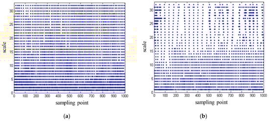 Figure 11 shows the time-frequency distribution of the wavelet coefficient mode maxima, with each blue point representing the wavelet transform mode maxima that appear at each time point and scale and the locations of the mode maxima that correspond to the signal singularity. Figure 11 shows that the wavelet transform mode maxima distribution spans the entire scale range. To reduce error in determining the temporal location of a single scale signal’s singularity, the wavelet transform mode maxima are averaged in the scale direction. That is, at each moment location, the mean values of the mode maxima at all scales are used to characterize the mutation in signal singularity.