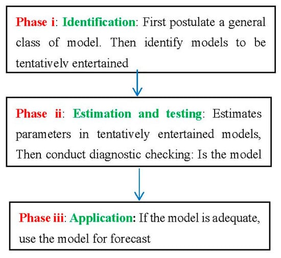 The study used Box–Jenkins Autoregressive Integrated Moving Average (ARIMA) time-series methodology for modeling and forecasting [30]. It is a widely used model in the world for forecasting purposes because of its very low forecast error and reliability of estimates (Figure 1). Many studies have used the ARIMA model for projections of demand for and supply of food [14,17,18,31,32,33,34,35].