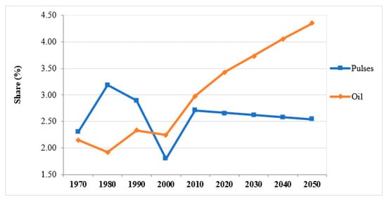 The share of pulses slightly decreased from 2.51% in 1990 to 2.06% in 2010, and afterward in the projection, consumption of pulses will slightly increase to 2.62% in 2030 and will be 2.5% in 2050. The share of oil rose from 2.33% in 1990 to 2.97% in 2010 and will further rise to 3.74% in 2030, and beyond that, it will rise to 4.35% (Figure 3 and Figure 4).