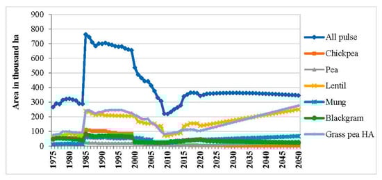 Projections of areas of all pulses of Bangladesh. Source: Authors’ estimation from BBS data.