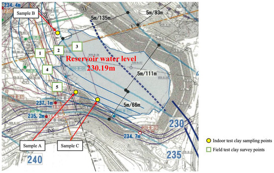 The Mw 6.2 foreshock and Mw 7.0 mainshock of the 2016 Kumamoto earthquakes occurred at 21:26 JST on 14 April and at 01:25 JST on 16 April, respectively. The earthquake sequence significantly damaged buildings and infrastructure around Kumamoto City [26]. During the investigation after the Kumamoto earthquake, a fault was found directly below the Ohkirihata Reservoir. According to the “Kumamoto Restoration and Rehabilitation 4-Year Strategy issued” by the Kumamoto Prefecture of Japan in December 2016, it was decided to build a new reservoir 237 m upstream of the original Kumamoto Ohkirihata Reservoir. This process produces considerable amounts of WDC sediments, which are classified as waste [27]. During the field investigation, WDC showed a high liquid limit different from other clays, and its natural water content was higher than its liquid limit.