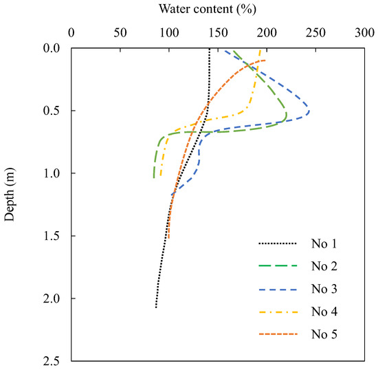 To confirm the sediment depth containing WDC in the Kumamoto reservoir, clay water content was measured in the Nos.1–5 areas along both the transverse and longitudinal directions of the reservoir, as shown in Figure 1. Water content values were obtained through a water content test [28] conducted on the sampled clay. The distribution of water content with depth in the Nos.1–5 area is illustrated in Figure 2. In the shallow areas of the reservoir, the depth of clay deposition with water content exceeding 100% was approximately 0–1.2 m below the horizontal position. Notably, locations No.2 and No.3 showed the highest water content (approximately 250%) at a depth of 0.5 m. In the longitudinal positions represented by areas No.4 and No.5, the clay exhibited extremely high surface water content (approximately 200%). In addition, loss-on-ignition (LOI) tests were performed on the clays collected from five different locations (Nos.1–5) to determine their organic matter content after heating them to 750 °C [29]. The results showed that the LOI values of Nos. 1–5 were 28.68%, 30.10%, 35.80%, 22.98%, and 26.15%, respectively. Organic matter begins to burn at a calcination temperature of 200 °C and is completely depleted at 550 °C [30]. Therefore, LOI is considered an important parameter to characterize the content of organic matter [31]. Moreover, high-organic clay typically has an LOI value greater than 20% [32]. It is important to note that expandable clay minerals may release their adsorbed and structural water upon heating during the LOI test, leading to an apparent weight loss [33]. Hence, the possibility of expandable clay minerals should be considered in the sample. Our results indicate that many WDC samples, containing high water and organic matter content, are present within the depth range of 0–1 m in the impoundment area of the Kumamoto Ohkirihata reservoir and within the depth range of 0–1.5 m in the shoal area.