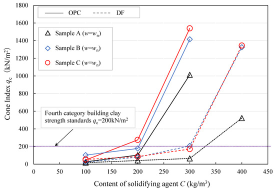 During the stabilization of high-water-content WDC with OPC, the hydration reaction produces calcium silicate hydrate (CSH) and calcium aluminate hydrate (CAH), and the production of these gel materials enhances the improvement effect of the sample [40,41,42]. In contrast to the stabilization process of WDC by OPC, the fly ash particles in DF are beneficial in reducing the voids in the mixed sample structure and making the microstructure of the sample denser, thereby improving the overall strength of the sample [43,44]. The results of the cone index test for WDC stabilized with solidifying agents under quantitative water content conditions are shown in Figure 3. The cone index of the stabilized soil with both OPC and DF solidifying agents rapidly increased when their respective contents exceeded 200 kg/m3 and 300 kg/m3.