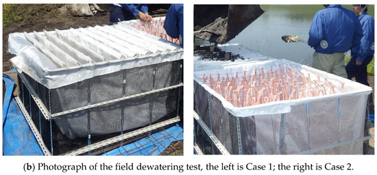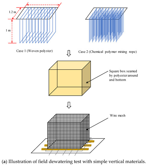 Two types of vertical drainage material were used in the tests: woven polyester for the Woven Polyester Drainage case and a chemical polymer mixture rope for the Chemical Polymer Rope Drainage case. The woven polyester was 0.60 mm thick, while the chemical polymer mixing rope had an 8.80 mm diameter. In the Woven Polyester Drainage case, the vertical drainage material with a size of 1.2 m × 1 m was connected to the steel rod with a spacing of 100 mm both horizontally and vertically. For the Chemical Polymer Rope Drainage case, a vertical drainage rope with a length of 1 m was connected to the steel rod with the same spacing. The steel rod was set at the upper end of the square woven polyester bag, which was surrounded by a wire mesh (as shown in Figure 4a). Field test photos of both drainage cases are shown in Figure 4b. Finally, wire meshes and stands with a 100 mm spacing of the drainage materials were incorporated into the sunshine dewatering method of NCPWT to create the simple vertical drain method for field dewatering conditions.