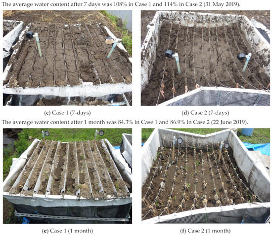 The WDC used in the field dewatering test was taken from the vicinity of the Sample A sampling site shown in Figure 1, and excavated from the pond without adjusting its natural water content. Subsequently, the soft WDC was poured into two dehydration boxes with different vertical drainage materials. Figure 5 shows the dewatering of WDC under field conditions after some time. Initially, as depicted in Figure 5a,b, the degree of saturation of the clay was high, indicating a wet state. However, after one week of dehydration, the clay surface started exhibiting dryness, as illustrated in Figure 5c,d. In Figure 5c, it is discernible that the area where the dehydrated material is embedded in the clay has a visible gap due to faster water evaporation. After one month of clay dehydration, the clay surface showed an extremely dry state, as shown in Figure 5e,f.