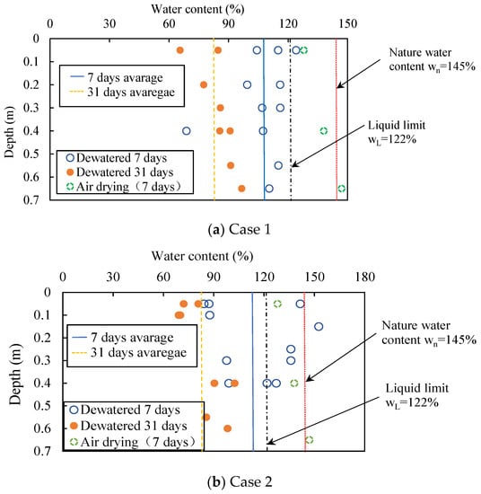 - Compared to the traditional sun-drying method, a simple on-site vertical dehydration method can reduce the water content of WDC to below the liquid limit within a week. After one month, the average water content of WDC decreases by approximately 35–38% below the liquid limit. Whether it is dehydrated for a week or a month, woven polyester achieved a better dehydration effect than chemical polymer mixed ropes.