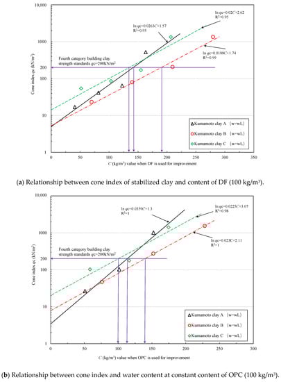 A cone penetration test, according to JIS A 1228 [37], was conducted to determine the cone index of the clays stabilized with solidifying agents. Table 2 summarizes the experimental conditions for the stabilized clay. The present study is a quantitative experiment on water content. All clay samples were in their natural water content state, i.e., w = wn. Based on this water content condition, two solidifying agents (DF and OPC) were mixed at amounts of 100, 200, 300, and 400 kg/m3, respectively. The cone index was calculated by dividing the average penetration resistance of the test sample at 50, 75, and 100 mm by the cone bottom area.