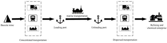 Bauxite is an important energy basis for national economic construction, and it plays an important role in ensuring the safety and sustainability of the industrial chain and supply chain. It underpins the rapid development of the aluminum industry, refractory materials, corundum abrasives and high alumina cement industries. With the challenge of satisfying the world’s growing energy demand, the consumption of bauxite is predicted to show a steady upward trend in various countries. According to the data of World Mineral Summary 2021, released by the US Geological Survey, global bauxite resources are distributed throughout Africa (32%), Oceania (23%), South America (21%), Asia (18%) and other regions (6%) [1]. Because of the uneven distribution of bauxite mines around the world, most countries’ external dependence on bauxite is increasing year by year. China, for example, ranks seventh, with 1 billion tons of bauxite reserves, accounting for 3% of the world’s bauxite reserves. In 2020, the import volume of bauxite hit a record high of 110 million tons, and the external dependence increased from 5% in 2001 to 50% [2]. Therefore, shipping and specialized ports are needed to transport and process bauxite over long distances. Maritime transportation is the major method of bauxite transportation due to its great economy and ability to move large volumes; in this context, the bauxite maritime supply chain (BMSC) is formed. A typical BMSC is illustrated in Figure 1. It starts with the extraction of the bauxite mine onshore, which is processed and stored before being concentrated transported to loading port by different participants using various modes of transportation. Over longer distances, subsequent transport overseas uses specialized vessels to move the bauxite to the receiving terminal. At the destination terminal, the bauxite is temporarily processed at the port, before being dispersed to chemical enterprises and other customers.