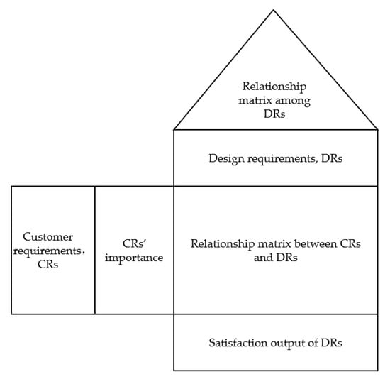 QFD is a systematic method used to transform customer requirements (CRs) into design requirements (DRs) of products, processes, services, and strategies that achieves the goal of improving process quality, reducing cost and enhancing customer satisfaction. Because of its wide applicability, QFD has been used in various fields [36,37,38], such as determining customer needs, developing priorities, manufacturing strategies, logistics and supply chain management. HoQ is the key technology of the QFD method; it can effectively show CRs and their importance, DRs and their autocorrelation, and the correlation between CRs and DRs. The HoQ consists of six main parts: (1) CRs; (2) DRs; (3) CRs’ importance; (4) the relationship matrix among DRs; (5) the relationship matrix between CRs and DRs; and (6) the satisfaction output of DRs. The structure of HoQ is shown in Figure 2.