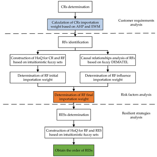 A QFD approach integrated with an analytic hierarchy process (AHP), an entropy weight method (EWM), DEMATEL and IFS is proposed in this paper to incorporate CRs into supply chain risk resilience management and achieve an effective BMSC resilience solution to minimize critical risks. This methodology will help managers to analyze serious RFs and their interrelationships, and determine the optimal RESs and their associations, both of which may be used to proactively build a resilient network, reduce risks and satisfy CRs. Here, we graphically present the overview of the entire methodology before describing it in detail, as shown in Figure 3. It is divided into three stages, namely customer requirements analysis, risk factors analysis and resilient strategies analysis. The proposed approach begins with determination of the weight for each CR. Secondly, the first HoQ is constructed to identify the relationships between CRs and RFs, and determine the initial severity of RFs. Then, the DEMATEL is applied to explore the casual relationships between RFs to determine the influence importance of RFs, which is integrated with the first HoQ to obtain the final severity of RFs. Thirdly, the second HoQ is established to model the relationships between RFs and RESs, and determine each RES’s priority. In order to address the inherent uncertainty of the relationship between things, the intuitionistic fuzzy set is used to reflect the fuzziness of the decision-making environment.