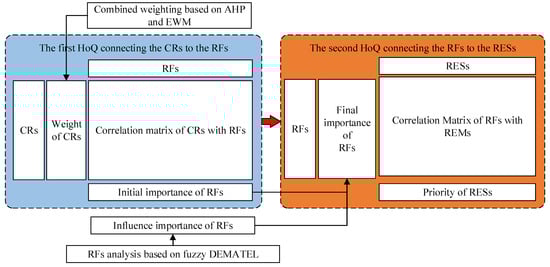 A two-stage HoQ model is constructed based on the QFD method, connecting CRs with RFs and RFs with RESs, respectively. The framework of HoQ is shown in Figure 4.