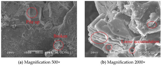 The effect of MICP reinforcement at different ambient temperatures was examined using scanning electron microscopy. Figure 11 shows the SEM images of each group of samples after crushing.