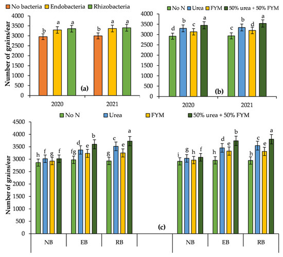 Yield-related traits were significantly affected by individual and interactive effects of N sources and bacteria inoculation during both years (except for the non-significant effect of bacteria inoculation and N sources by bacteria inoculation interaction on harvest index in 2020). Overall, the highest number of grains per ear was recorded for urea + FYM application and seed inoculation with RB during both years. Urea + FYM application improved the number of grains per year by 18.00% and 20.46%, while seed inoculation with RB increased the number of grains per year by 13.57% and 13.55% in 2020 and 2021, respectively, compared to control treatment. Nitrogen sources by bacteria inoculation interaction revealed that urea + FYM combined with RB inoculation resulted in the highest values of the number of grains per ear, whereas no N application without bacteria inoculation recorded the lowest values in this regard during both years. Urea + FYM combined with RB inoculation improved the number of grains per ear by 23.49% and 23.63% in 2020 and 2021, respectively (Figure 2).