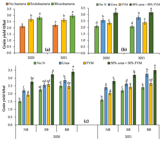The impact of nitrogen-fixing bacteria inoculation (a), different nitrogen sources (b), and their interaction (c) on grain yield of millet. The values are means ± SE (n = 3). The means with same letters are statistically non-significant (p > 0.05). Here, FYM = farmyard manure; NB = no bacteria inoculation; EB = seed inoculation with endobacteria; and RB = seed inoculation with rhizobacteria.