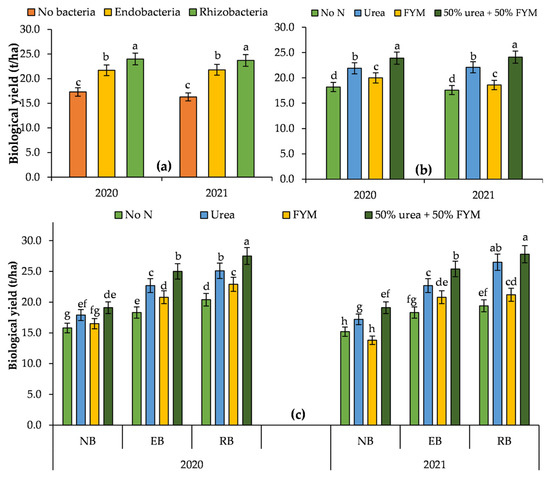 The impact of nitrogen-fixing bacteria inoculation (a), different nitrogen sources (b), and their interaction (c) on biological yield of millet. The values are means ± SE (n = 3). The means with same letters are statistically non-significant (p > 0.05). Here, FYM = farmyard manure; NB = no bacteria inoculation; EB = seed inoculation with endobacteria; and RB = seed inoculation with rhizobacteria.