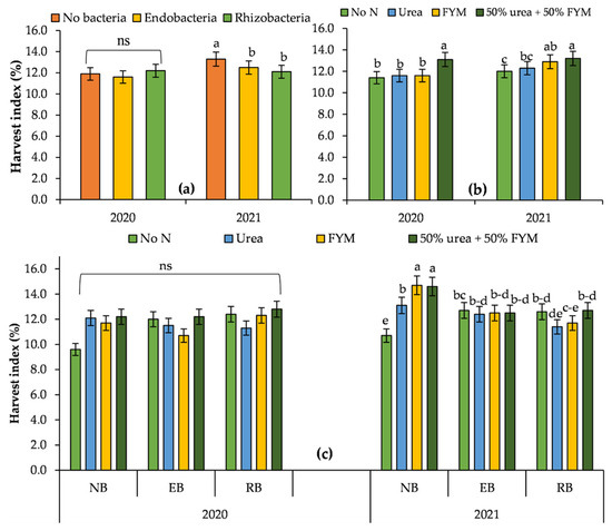 The impact of nitrogen-fixing bacteria inoculation (a), different nitrogen sources (b), and their interaction (c) on harvest index of millet. The values are means ± SE (n = 3). The means with same letters are statistically non-significant (p > 0.05). Here, FYM = farmyard manure; NB = no bacteria inoculation; EB = seed inoculation with endobacteria; and RB = seed inoculation with rhizobacteria.