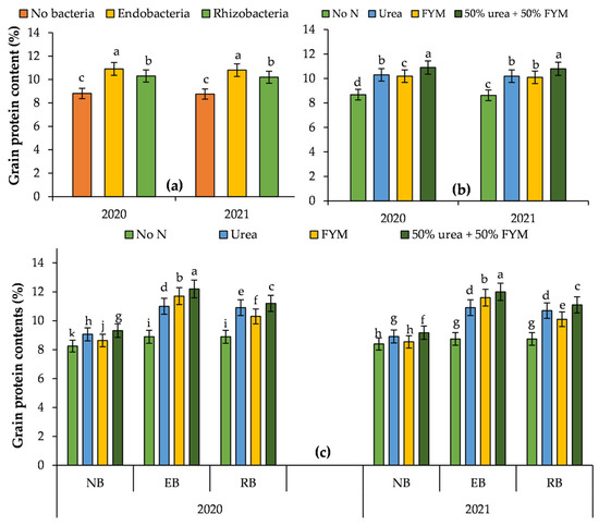 The individual and interactive effects of N sources and bacteria inoculation had a significant effect on grain protein contents during both years. Overall, urea + FYM application and seed inoculation with EB resulted in the highest values of grain protein contents during each year. Urea + FYM application increased grain protein contents by 25.58% and 25.14%, whereas seed inoculation with EB improved it by 16.91% and 16.44% in 2020 and 2021, respectively, compared to control treatments. Regarding the interactive effect, urea + FYM combined with EB seed inoculation resulted in the highest grain protein contents during both years of the study. The grain protein contents were increased by 30.90% and 30.86% in 2020 and 2021, respectively, compared to no N application by no seed inoculation interaction (Figure 7).