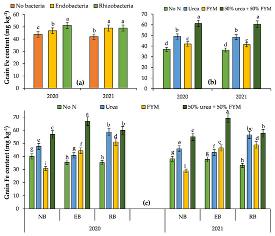 The impact of nitrogen-fixing bacteria inoculation (a), different nitrogen sources (b), and their interaction (c) on grain iron content of millet. The values are means ± SE (n = 3). The means with same letters are statistically non-significant (p > 0.05). Here, FYM = farmyard manure; NB = no bacteria inoculation; EB = seed inoculation with endobacteria; and RB = seed inoculation with rhizobacteria.