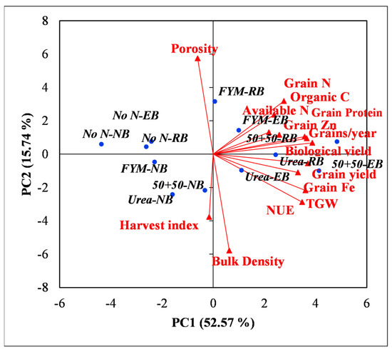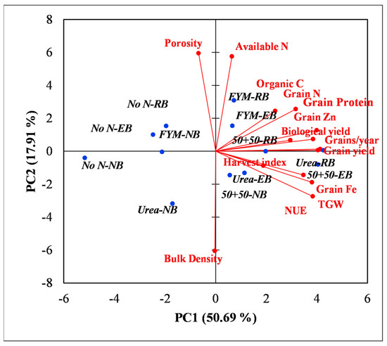 Biplot of first two components of principal component analysis executed on growth, yield, and grain quality traits of millet crop grown under individual and interactive effects of different nitrogen sources and nitrogen-fixing bacteria inoculation in 2021. Here, FYM = farmyard manure; NB = no bacteria inoculation; EB = seed inoculation with endobacteria; RB = seed inoculation with rhizobacteria; NUE = nitrogen use efficiency; and TGW = 1000-grain weight.